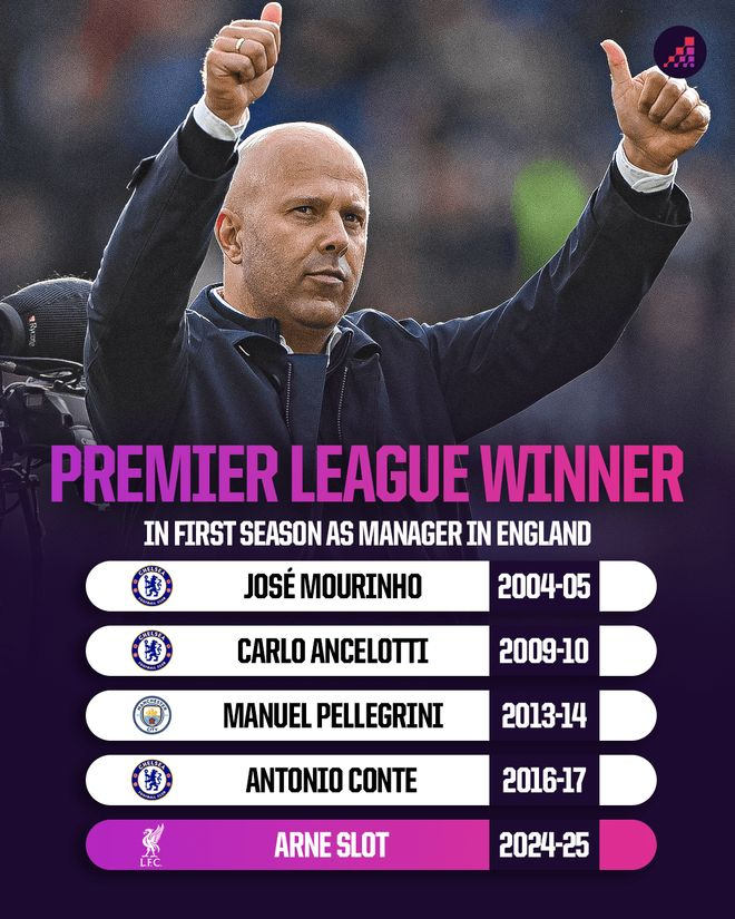 阿尔内·斯洛特加入了一个专属俱乐部,成为仅有的五位在执教英格兰球队的第一个赛季就赢得英超冠军的主教练之一。第一位是2004-05赛季,自称“特殊的一个”的若泽·穆里尼奥带领切尔西夺冠。