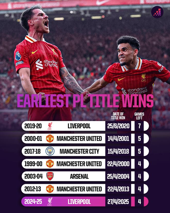 尽管利物浦还有对阵切尔西(客)、阿森纳(主)、布莱顿(客)和水晶宫(主)的联赛未踢,但2024-25赛季的英超冠军归属已定。