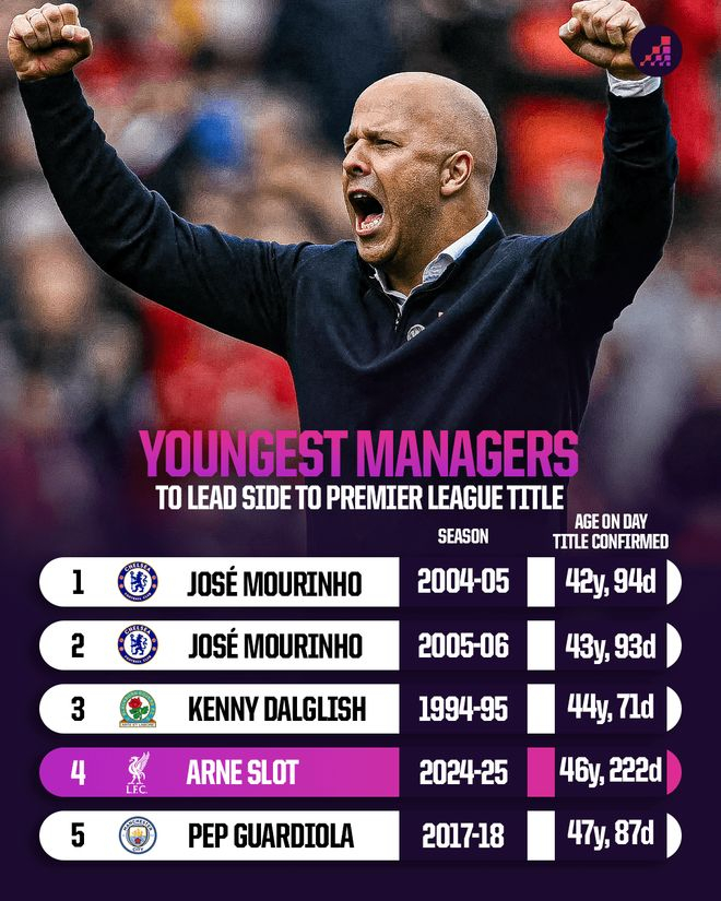 凭借这次夺冠,斯洛特成为带领球队赢得英超冠军的第三年轻主教练,仅次于穆里尼奥和达格利什。