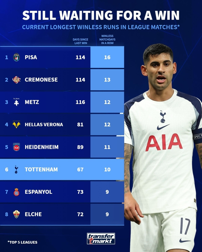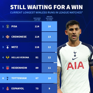 五大联赛球队目前最长联赛不胜场次:比萨16场第1,热刺10场