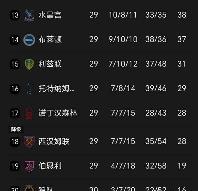 排名倒数的狼队和伯恩利,基本已经没什么上岸的可能。利兹联、热刺、诺丁汉森林三支队伍深陷降级区附近,现在要抢最后一个保级名额。谁能想到热刺会挤在这个行列里,说出去几年前谁都不信。