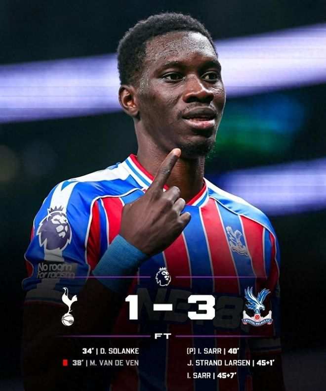 37分钟范德文和萨尔在禁区犯规送了点球,范德文还被红牌罚下,热刺直接少打一人。第40分钟萨尔点射命中把比分扳成1-1平,热刺赶紧换人调整,加拉格尔和比苏马替补登场想稳住局势,结果根本没拦住水晶宫的攻势。半场结束前水晶宫连进两球,46分钟拉尔森破门,52分钟萨尔再下一城,直接把比分改写成3-1。