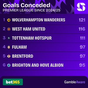 赛后Squawka数据统计,自上赛季以来英超失球数最多的球队如下: