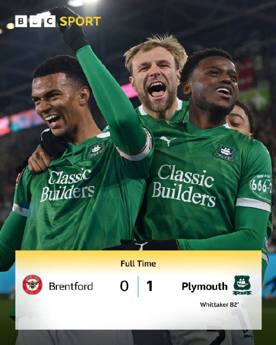 2. 创造顶级联赛耻辱:足总杯史上仅第四次出现英超领头羊被非顶级联赛球队淘汰的奇观,普利茅斯的名字从此与“巨人杀手”的史诗并列;