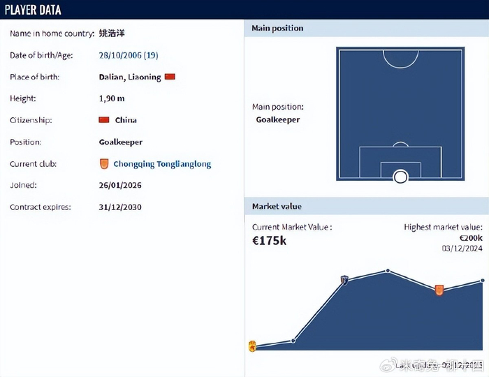 出生于2006年10月的门将姚浩洋,身高达到1米95,上赛季租借重庆铜梁龙期间有着出色的发挥,也是球队冲超的功臣。要知道早在2024年,18岁的姚浩洋就已经在外租时当选中甲最佳门将。所以为了他花费700万元人民币,也是重庆铜梁龙求贤若渴。