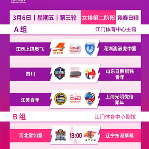 2026年03月06日,#2026年全国青年排球挑战赛#🏐 女子组将在江门体育中心展开第二阶段第三日较量。具体赛程如下:A组13:00 江西上饶奥飞 vs 深圳澳洲虎中塞15:00 四川女排 vs 山东日照钢铁青年17:00 江苏青年 vs 上海光明优倍青年B组13:00 河北雪如意 vs 辽宁东港草莓15:00 云南滇池学院 vs 福建安溪铁观音青年17:00 南京师范大学 vs 辽宁青年