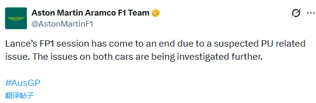阿斯顿马丁车队声明,与FP1未登场的队友阿隆索一样,斯托尔的赛车同样也是遇到了动力单元相关的问题。两辆赛车的故障原因正在进一步排查中。
