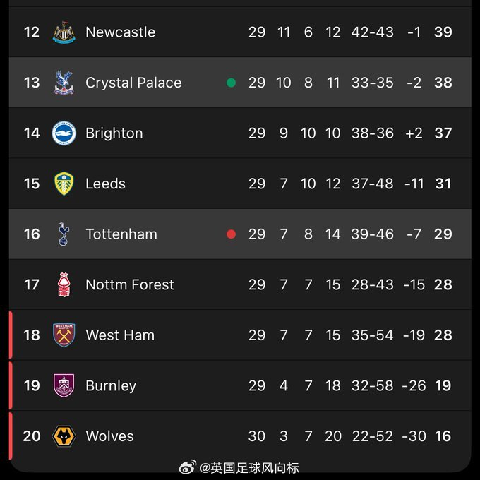 在联赛积分榜上面,由于倒数第三的西汉姆联连续拿分,目前降级区外的热刺(第16位),仅仅是高出降级区一分,随时有可能掉进降级区。