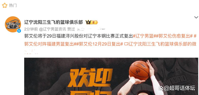 12月27日,CBA俱乐部辽宁男篮官方宣布国手郭艾伦将于12月29日复出,届时郭艾伦将代表辽宁出战和福建的比赛。官方具体说道:“郭艾伦将于29日福建浔兴股份对辽宁本钢比赛正式复出。”