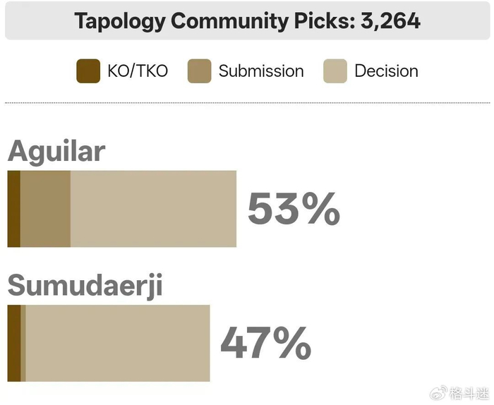 在赔率上,苏木达尔基是被高度看好的一方,赔率达到-240,而阿吉拉尔则为+190 。博彩公司认为,苏木达尔基只要能将比赛控制在站立状态,凭借其身高臂展和打击技术,获胜将是大概率事件。然而,在TAPOLOGY的预测中,拳迷的观点再次与赔率唱起了反调,仅有47%的人看好苏木达尔基。