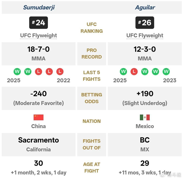 他本场的对手是墨西哥选手阿吉拉尔,与擅长站立打击的苏木达尔基截然相反,阿吉拉尔是一位纯粹的“地面绞杀机”——他职业生涯中7次降服对手获胜,且大部分都在首回合解决战斗。