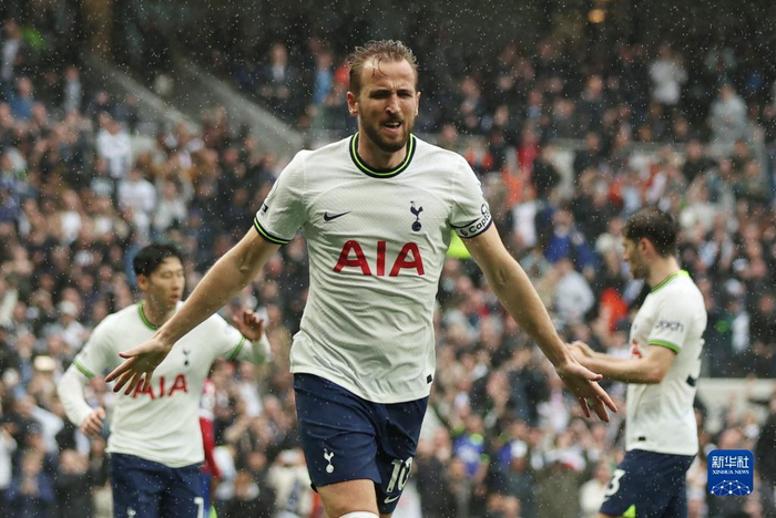 5月6日,热刺队球员凯恩(中)在比赛中庆祝进球。