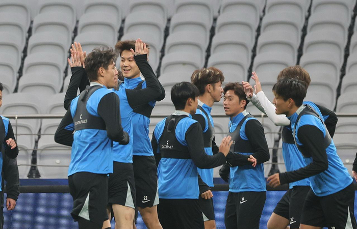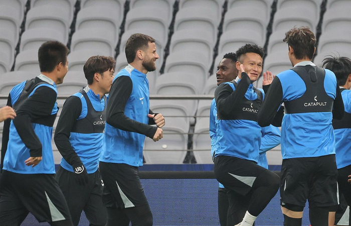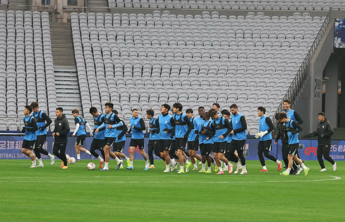 毛伟杰、宋岳等大连英博海发球员踏入上海体育场,准备进行例行的赛前一天踩场训练,从训练过程看,全体球员心态轻松,一片欢声笑语。