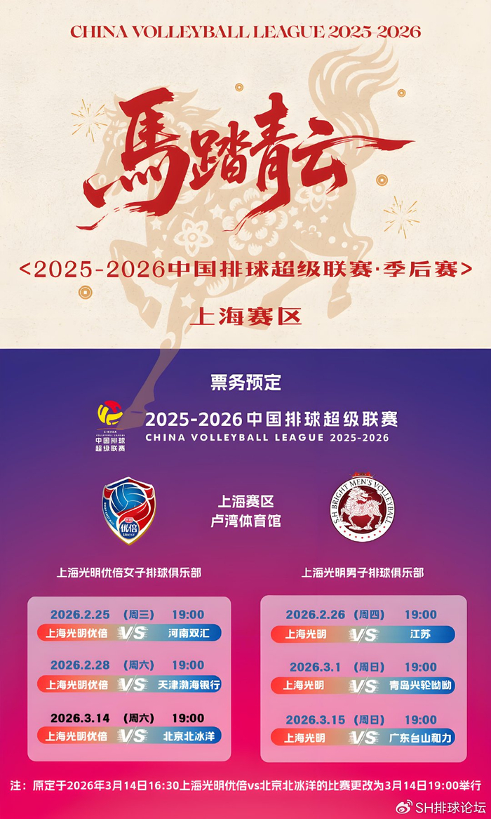 根据2025-2026中国排球超级联赛赛程,女排联赛第二十轮第78场上海光明优倍女排对阵北京北冰洋女排的比赛原定于2026年03月14日16:30进行。接中国排球超级联赛组委会通知,本场比赛现调整至2026年03月14日19:00进行。