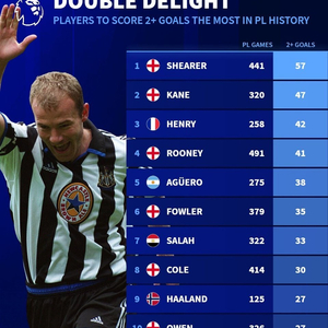 北京时间3月6日,德转统计出了英超历史单场进球2+场次最多的10名球员,阿兰-希勒57场排名第1,哈里-凯恩47场第2,亨利42场第3。