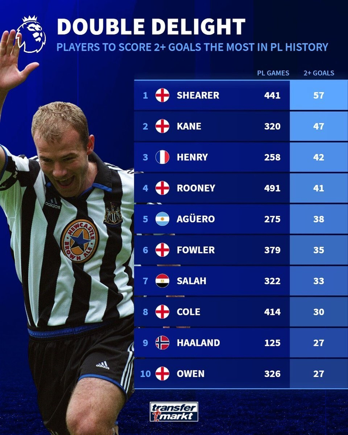 德转统计英超历史单场进球2+场次TOP10: