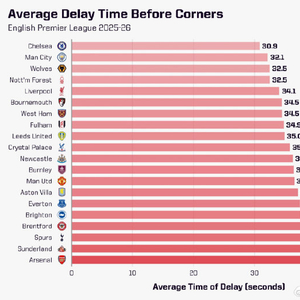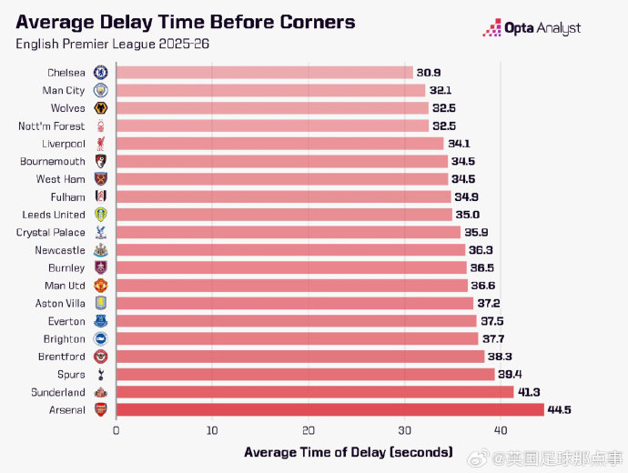 Opta统计2025/26赛季英超各队角球前平均延误时间(从少到多排序)↓