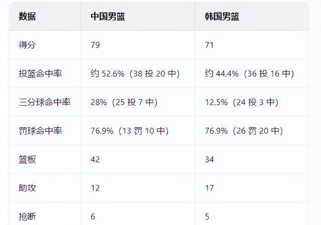从技术统计来看,中国队胡金秋发挥出色,15投11中贡献23分11篮板,王俊杰命中3记三分得到21分8篮板。韩国队方面,李贤重拿下22分7篮板4助攻,河允基贡献15分9篮板。尽管韩国主教练在比赛中多次与裁判交涉,但最终仍以8分差距落败。有分析指出,这个分差实际上小于双方实力的真实差距。