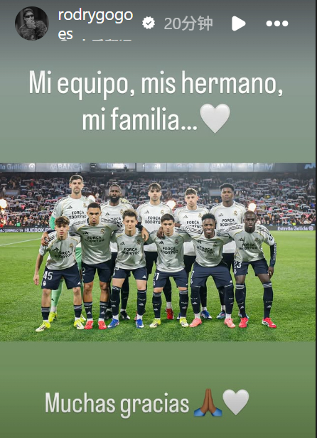 随后,罗德里戈在社媒发文表达了感谢:“我的球队、我的兄弟、我的家人,非常感谢你们。”