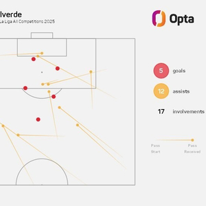 至此,巴尔韦德本赛季代表皇家马德里在各项赛事已直接参与17球(5球12助),追平皇马生涯单赛季第二多参与进球纪录(2024-25赛季也是17球),仅次于2022-23赛季的19球。