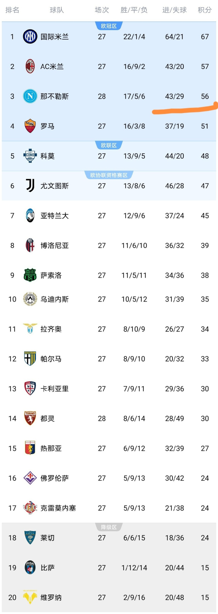 可以看到那不勒斯队在击败都灵之后,积分上涨到了56分,仅差第2的AC米兰1分,落后榜首的国米11分,那不勒斯队争冠希望依然不大,但是争亚军希望还是很大的。