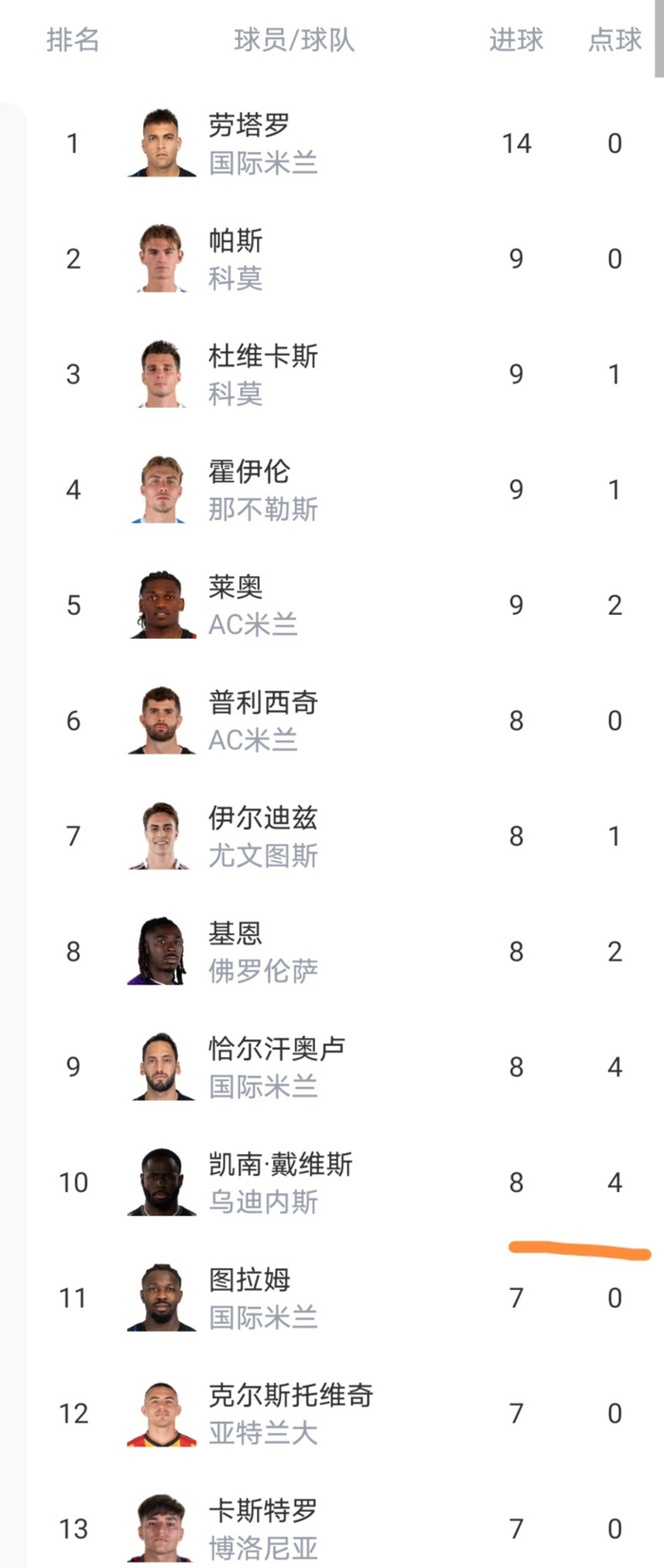 意甲射手榜前13如下: