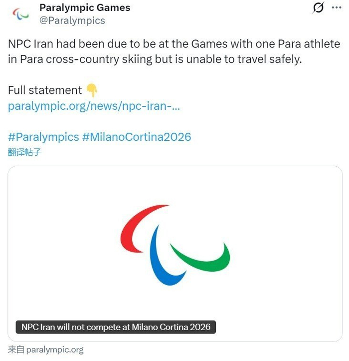 国际残奥委会在声明中表示,3月6日下午正式确认,伊朗残奥委会将不会参加米兰-科尔蒂纳2026冬季残奥会的比赛。