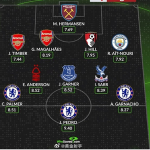 前锋:帕尔默(切尔西)、佩德罗(切尔西)、加纳乔(切尔西)