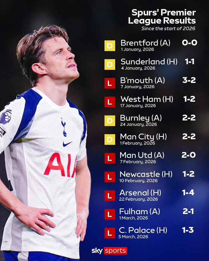 周四晚1比3输给水晶宫后,英超11场不胜兼5连败的热刺,在29轮后仅积29分排名第16位,距离降级区1分。而118天前,主场逼平曼联的热刺还在第5位的欧冠区。10年前热刺英超夺冠赔率是7/2,如今降级赔率是9/2几乎相当。2月13日图多尔接替弗兰克,非但没有止住热刺的自由落体,还以3连败让降级形势继续恶化。目前11场联赛不胜的热刺,队史成绩仅好于1935年(15场联赛不胜)。自1977年以来,热刺又一次不得不面对从英格兰顶级联赛降级可能的严峻危机。