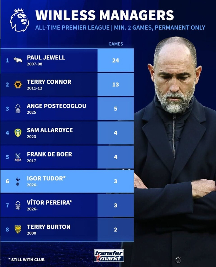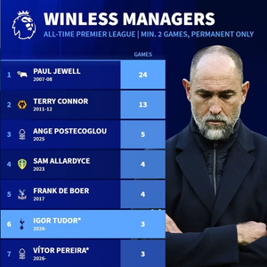 英超历史新帅最长开局不胜(正式主帅且至少执教2场):