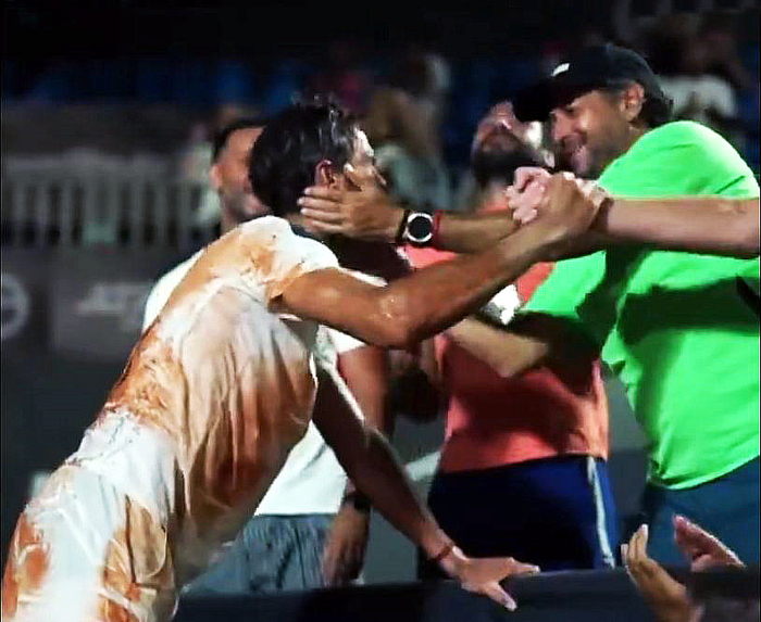 最后来猜一猜认一认。下面这张图片是一位球员获胜后和教练团队庆祝。不作提示,您能认出他是谁吗?