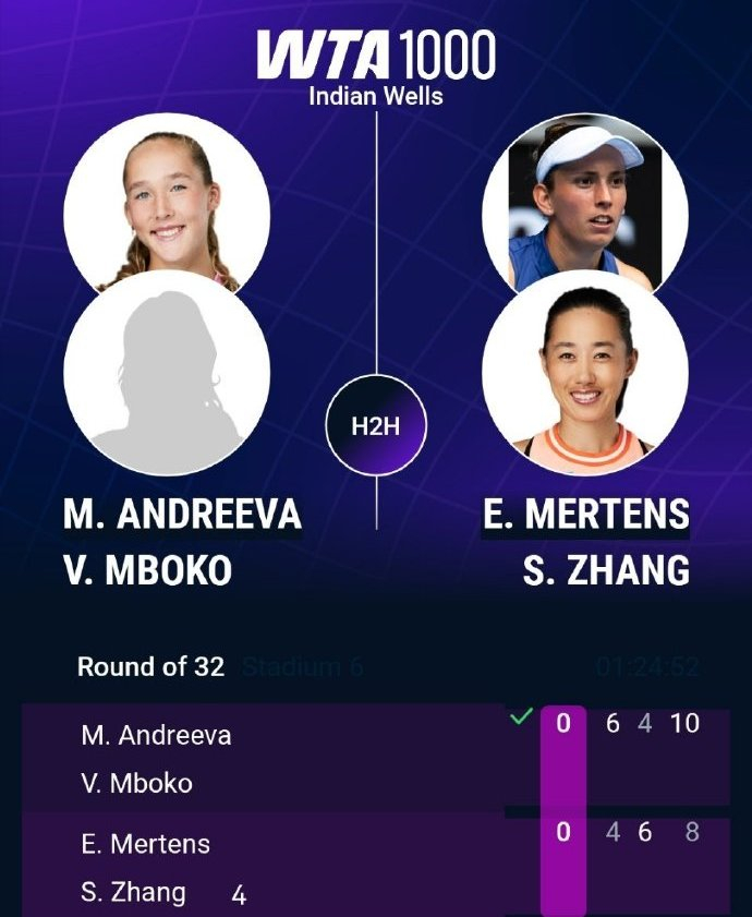 双打首轮:中国老将张帅与比利时人梅尔滕斯的跨国组合以4-6 6-4 8-10不敌俄加组合米拉-安德列娃/姆博科,无缘晋级。至此,张帅在单双打赛场上都遭遇一轮游,双线出局。另一对中国组合徐一璠/杨钊煊以6-3 6-0送蛋横扫本西奇/科斯蒂亚,强势挺进次轮。