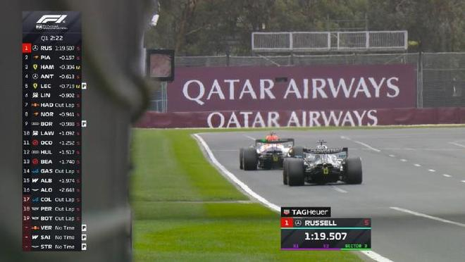 Q1结束,拉塞尔P1,皮亚斯特里第二,汉密尔顿第三,科拉平托最后时刻惊险超过阿隆索。