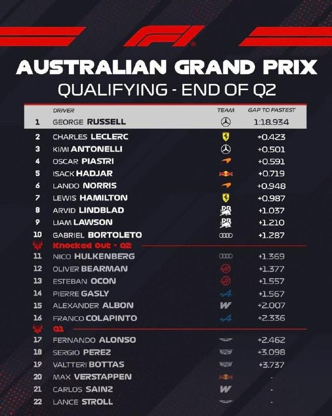 Q2结束,拉塞尔依然排在第一,勒克莱尔和安东内利分列二三。