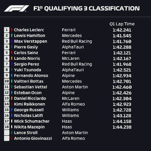 梅赛德斯双雄在多跑了1圈之后,汉密尔顿冲到第2,博塔斯则排在第8位。红牛二队的两位车手在所有车手都跑完计时圈后才登场,加斯利在飞驰圈中险些撞到护墙,但还是在队友角田裕毅的尾流带动下冲到第4位。