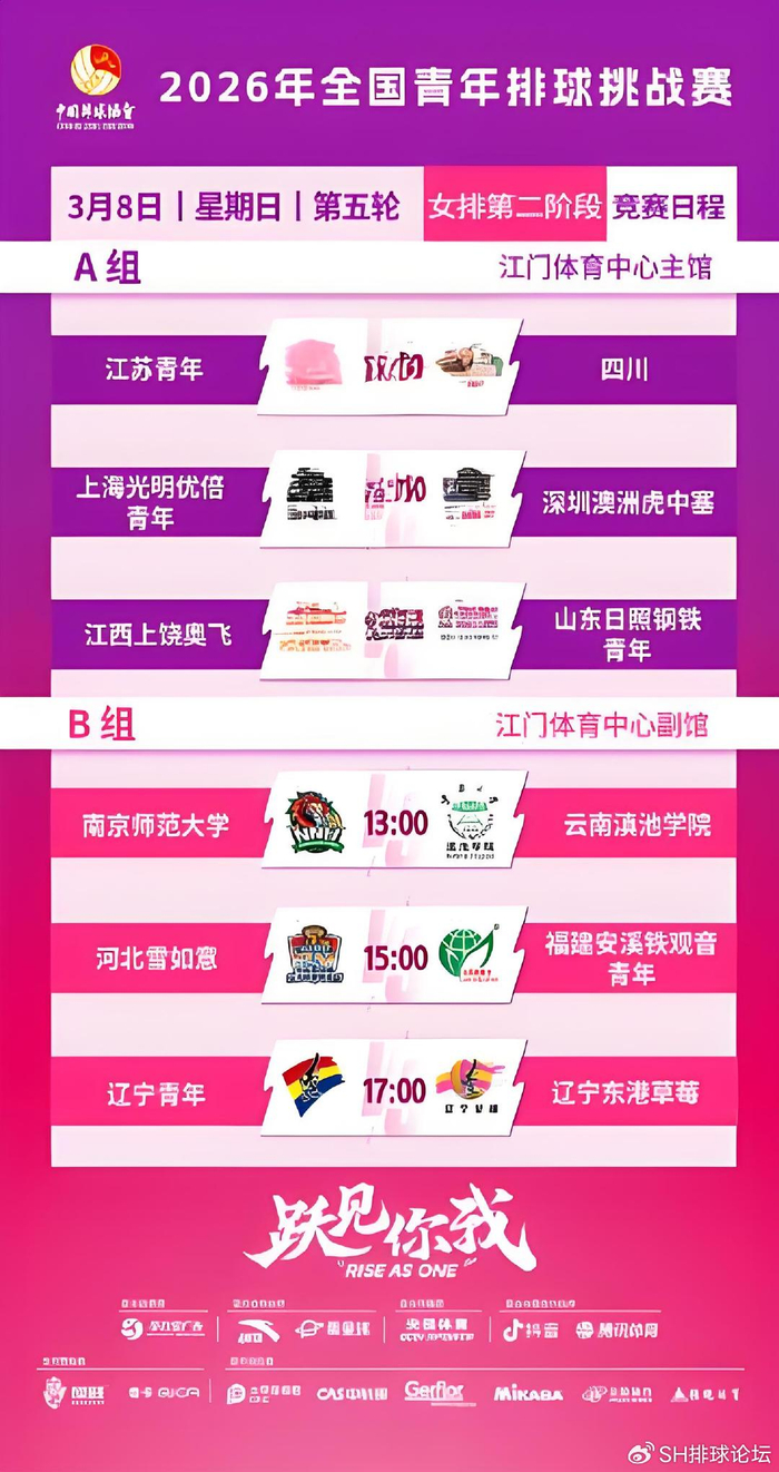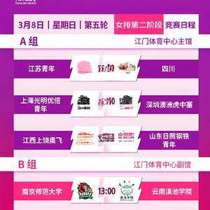 2026年03月08日,#2026年全国青年排球挑战赛#🏐 女子组将在江门体育中心展开第二阶段第五日较量。具体赛程如下:A组13:00 江苏青年 vs 四川女排15:00 上海光明优倍青年 vs 深圳澳洲虎中塞17:00 江西上饶奥飞 vs 山东日照钢铁青年B组13:00 南京师范大学 vs 云南滇池学院15:00 河北雪如意 vs 福建安溪铁观音青年17:00 辽宁青年 vs 辽宁东港草莓