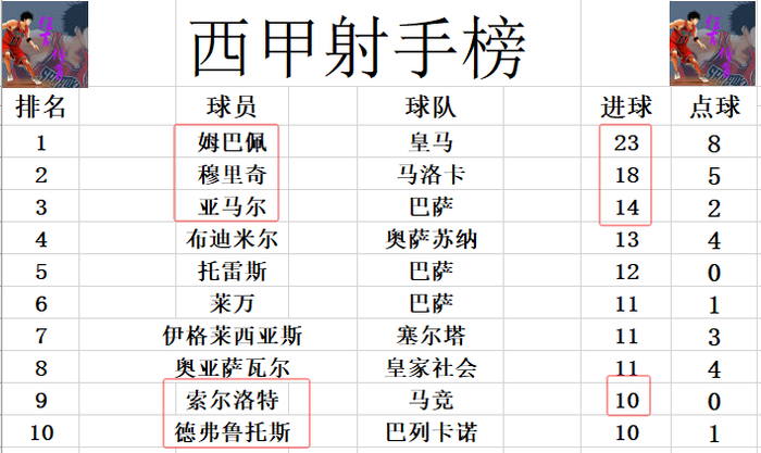 射手榜方面,姆巴佩23球领跑,穆里奇趁着姆巴佩伤缺紧追上来,今天梅开二度后将差距缩小到5球。亚马尔打入制胜球,14球位列第3,布迪米尔13球排在第4。索尔洛特破门,追上德弗鲁托斯,将前十门槛提高到10球。