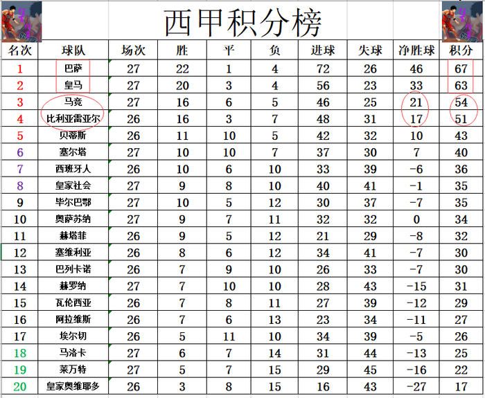 积分榜方面,巴萨今天险胜赢球后,再次将对皇马的优势拉大到4分,稳住榜首位置。马竞先赛赢球,领先比利亚雷亚尔3分,第3的位置暂时也是稳住。保级方面,马洛卡无力赢球,继续深陷降级区。