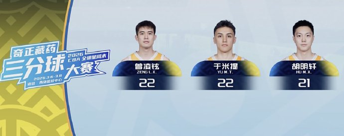 三分球大赛的预赛中,于米提、曾凌铉投出了22分的高分,携手投出21分的胡明轩晋级决赛。