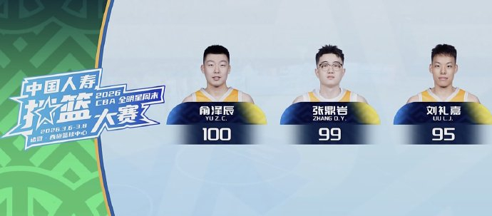 辽宁小将俞泽辰以两度50分的扣篮拿到预赛第一,网红扣篮王张鼎岩则是以99分位居第二,上海锋线刘礼嘉以95分紧随其后。