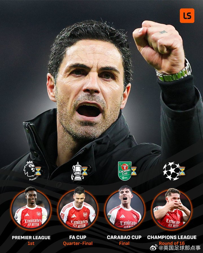 阿森纳四线争冠保持全胜,足总杯晋级八强 英国足球那点事 优质体育领域创作者 03.0813:08 关注 LiveScore:阿森纳的“四冠王”依然充满希望🤩🏆#曼斯菲尔德1比2阿森纳#🏆英超榜首🏆足总杯1/4决赛🏆联赛杯决赛🏆欧冠1/8决赛