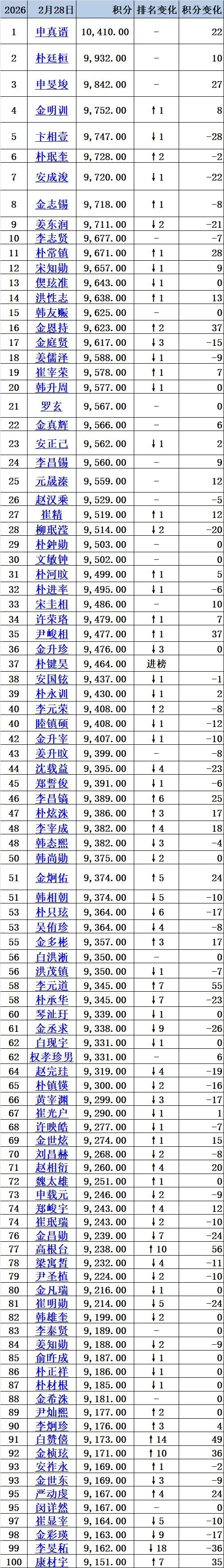 金恩持与崔精的积分差从上月的79分拉大到本月的104分。在男女综合排名中,崔精位列第27位,吴侑珍第53位,金彩瑛第98位,仲邑堇第101位,曹承亚七位列第138位。