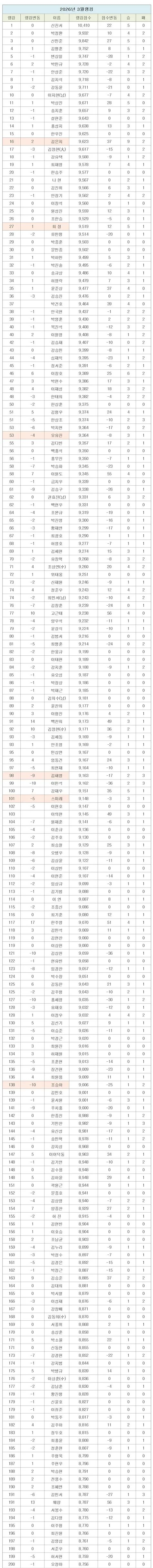 卞相壹九段(1胜2负)、安成浚九段(3胜2负)的排名较上月有所下降。第8位是上升一个位次的金志锡九段,第9位是下降两个位次的姜东润九段(1负),第10位是排名无变动的李志贤九段。因长期无对局而一度脱离排名榜的朴键昊九段,在退伍后立即打入第6届最高棋士决定战本赛,重新进榜排在第37位。