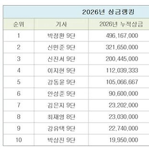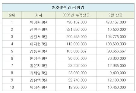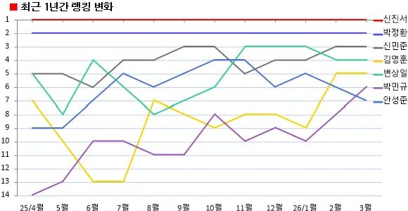 申旻峻九段(2月战绩5胜)保持上个月的第3位。与此同时,金明训九段(5胜1负)上升一个位次至第4位,创个人最高排名。朴珉奎九段(4胜2负)也上升两个位次至第6位,同样刷新个人最高排名。