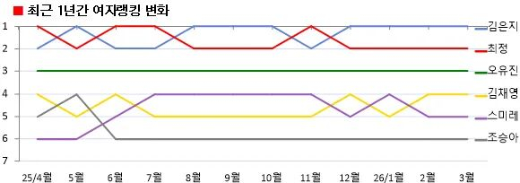第2至第6位分别为:崔精九段(5胜1负)、吴侑珍九段(3胜1负)、金彩瑛九段(2胜3负)、仲邑堇四段(3胜1负)、曹承亚七段(1胜2负),与上月相同。