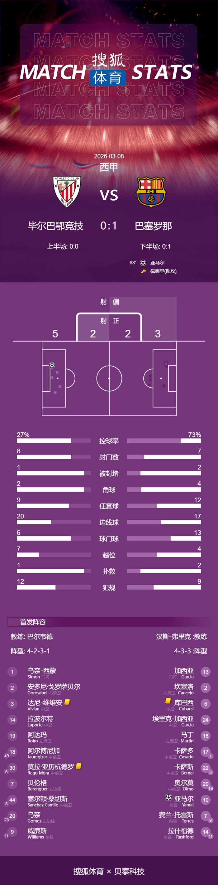 巴塞罗那:13-霍安-加西亚、24-埃里克-加西亚、5-库巴西、18-赫拉德-马丁、2-坎塞洛、17-卡萨多(第78分钟4-阿劳霍)、22-伯纳尔(第46分钟8-佩德里)、20-奥尔莫(第62分钟16-费尔明)、7-费兰-托雷斯(第62分钟11-拉菲尼亚)、10-亚马尔、14-拉什福德(第62分钟9-莱万多夫斯基)