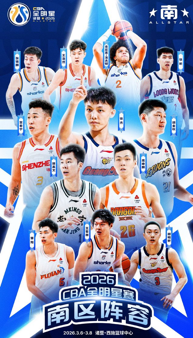 南区明星队领队是中国女篮名宿丛学娣,教练员是卫冕冠军浙江广厦(浙江方兴渡)主帅王博,助理教练员是前中国篮球掌舵人姚明(晚池注:已经下课)老东家、CBA头号土豪上海男篮主帅卢伟。翻译:王彦青(上海);队医:张金强(深圳男篮)。南方明星队先发五虎为:贺希宁(深圳)、胡金秋(浙江广厦)、郭昊文(南京同曦)、徐杰(CBA11冠王广东男篮)、庞峥麟(江苏男篮)。替补球员:王浩然(深圳)、胡明轩(广东)、徐昕(广州男篮)、肯尼思·洛夫顿(上海)、被球迷戏称为王老太太的王哲林(上海)、张镇麟(上海)、邹阳(福建)。