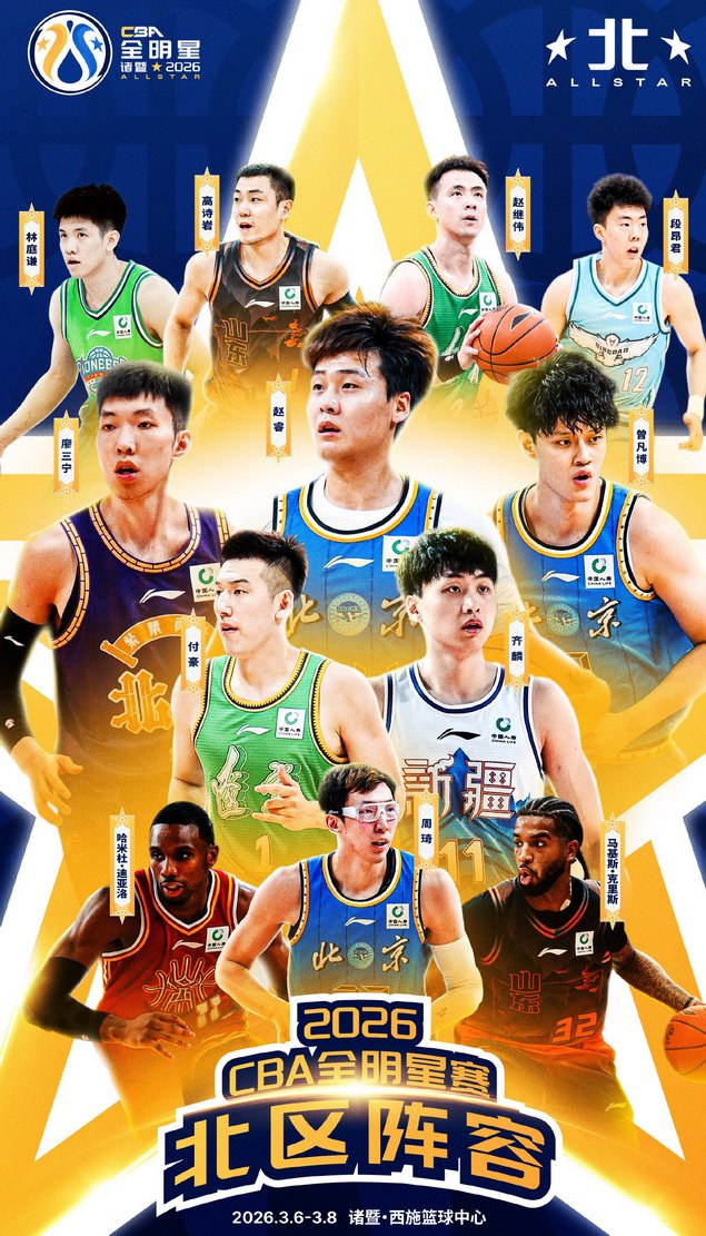 北方明星队首发球员为(后面的括号是效力的球队):赵睿和曾凡博(夺冠大热门御林军北京首钢)、齐麟(CBA昔日土豪新疆男篮)、付豪(老牌球队辽篮)、廖三宁(北京北控)。