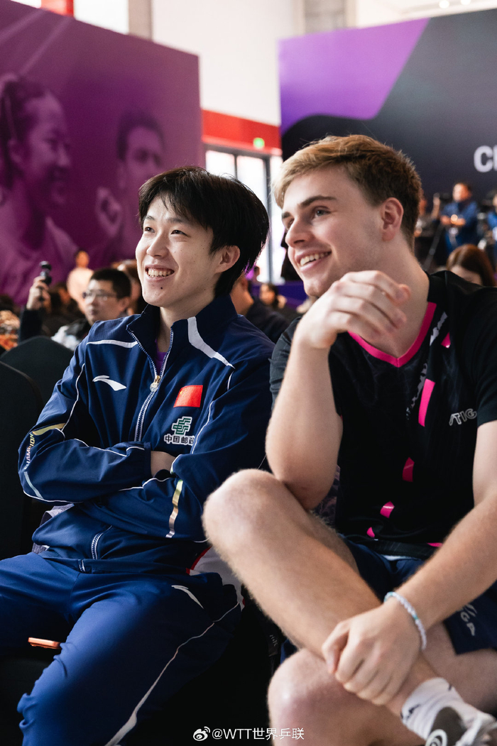 下午,王楚钦还参加了重庆冠军赛的抽签仪式。抵达抽签现场之后,王楚钦发现自己是运动员代表中第一个到的,他直呼:“催半天,我是第一个来的!”活人感十足。除了王楚钦,参加抽签仪式的还有瑞典的莫雷加德、代表中国澳门出战的朱雨玲、德国的沙宾·温特。王楚钦和莫雷加德一起抽出女单签表,这对老朋友在台下坐着的时候更是热聊不断,聊到开心时,两人都笑得前仰后合。在抽签仪式结束后,四位抽签嘉宾也一起合影留念。