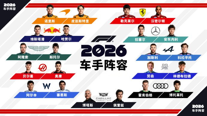 2026年的车手合影首次呈现11支车队、22位车手的庞大阵容,这是自2016年哈斯车队加入后F1十年来的首次扩军。凯迪拉克车队的亮相尤为瞩目——其红黑涂装赛车与车手制服在合影中形成鲜明色块,象征着美系制造商重返顶级赛事的野心。与此同时,中国车手周冠宇以凯迪拉克储备车手身份参与合影,虽未驾驶赛车,但其站位靠近车队核心,体现了中国市场与F1的深度联结。而阿尔派车队因内部调整缺席揭幕战,使得合影成为新旧时代交替的直观记录。